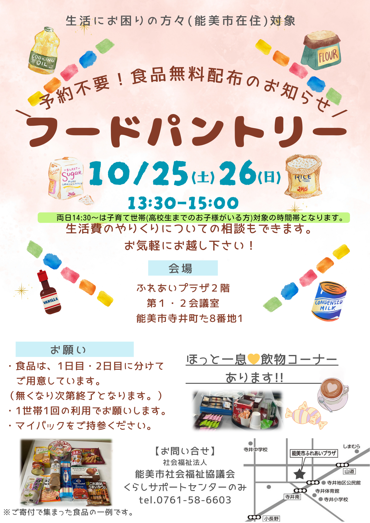10月25日(土)26日(日)の2日間にわたって、市民の方々や団体・企業のご寄付で集まった食料品を無償でお配りします。事前予約は不要です。会場はふれあいプラザ2階です。ほっと一息❤カフェコーナーもあります。カフェコーナーのみの利用も可能です。